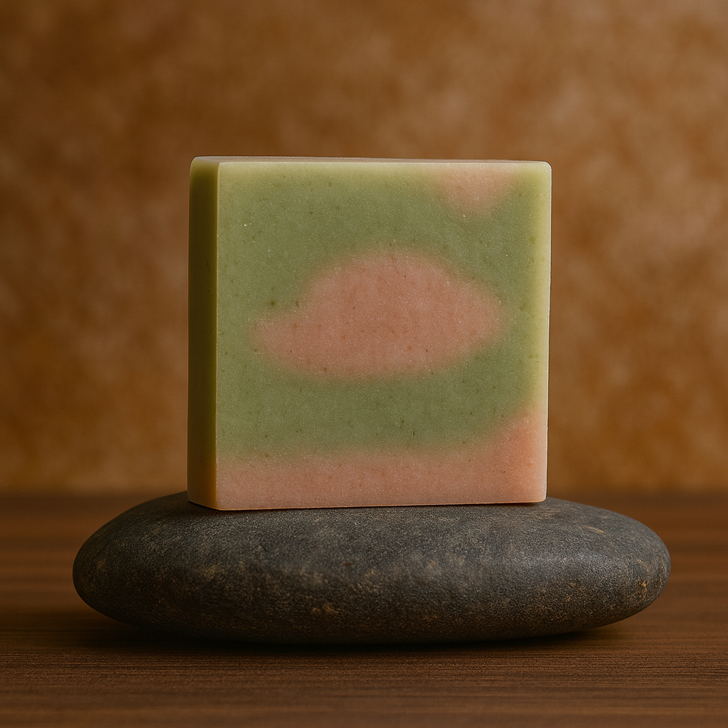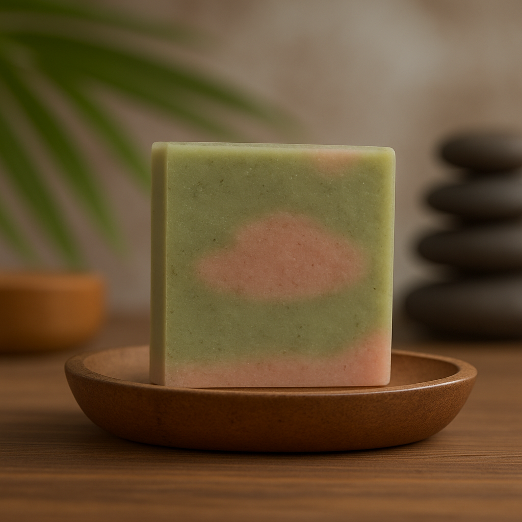 Infused with the crisp, purifying notes of Tea Tree and Rosemary Essential Oils. 100% natura handcrafted 4.5 oz bar crafted from Spirulina Powder and Madder Root Powder.